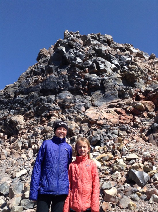 Nina and Ellamae standing beneath a spire of Obsidian and other igneous rock including Rhyolite and Pumice.