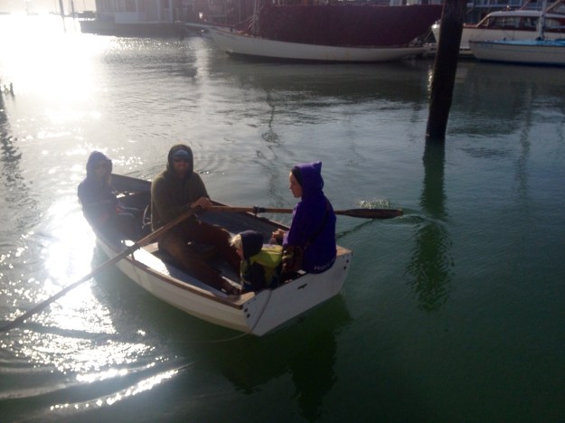 Oh it feels so nice when I get home from working all night (as an NICU RN at UCSF) and I’m greeted by my family rowing in to get me. Today, rather than picking me up and taking me back out , they hopped out of the dinghy to roam around on land for the day. I hopped in the dinghy to row it back to the boat so that I can get a few hours of sleep in. This seems to work pretty well for us, but we are definitely looking forward to when we leave and have a good little break from work. Off to bed I go. Goodnight San Francisco. Enjoy the foggy day 🙂