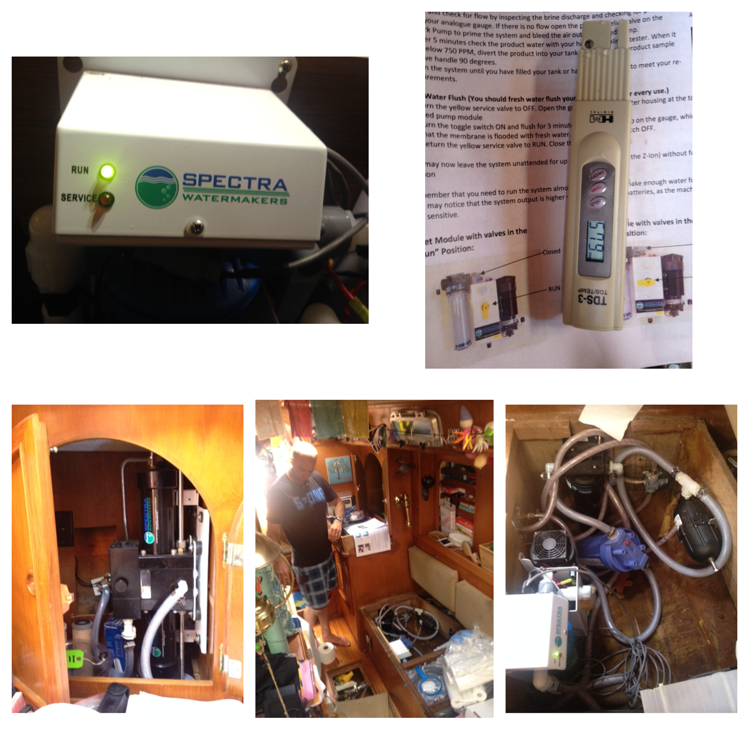 We started our Spectra WaterMaker today. First a purge of the system (a 30 minute process) since its been in its “preserved” state. We found a few leaks around the primary filter housing that needed to be fixed. And a few more at some connection sites. Then water making mode started!