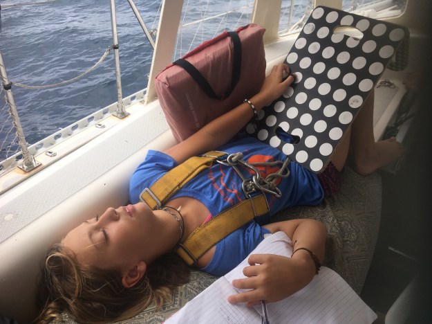 Shawnigan crossed the Equator, into the Southern Hemisphere about 90 miles Northeast of Isla San Cristobal. We had all our celebratory items and our offerings to Neptune ready to go. At 11:57 am, on our eighth day out at sea, we crossed the Equator. We had a count down using our GPS until it read “00°00.000’S, 88°14.378’W ” ! Taj tossed a pancake into the water for Neptune. Each kid blew the conch shell. The girls dressed up like mermaids, make-up and all. Taj had his crown and cape on. Both Christian and I wore our homemade paper crowns, pulled out our bag of Equator Coffee, made a cup of bulletproof coffee style and shared it with Neptune. Ellamae ended our ceremony with a poem by John Masefield: “One road leads to London, One road runs to Wales, my road leads me seawards to white dipping sails.”