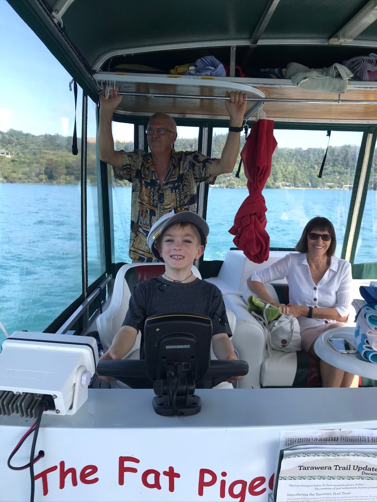 From there just Taj and I, Mom and Phill continued the tour on up to Auckland, where they would fly back to the US. Along the way I had to show them Flat Hills Cafe and tourist stop and Lake Taupo. We rented an Airbnb called the “Fat Pigeon” aka Pukeko at a small lake near Rotorua called Tarawera. What a lovely place to swim and go out on the house owner’s boat to see the local birds and take another dip.