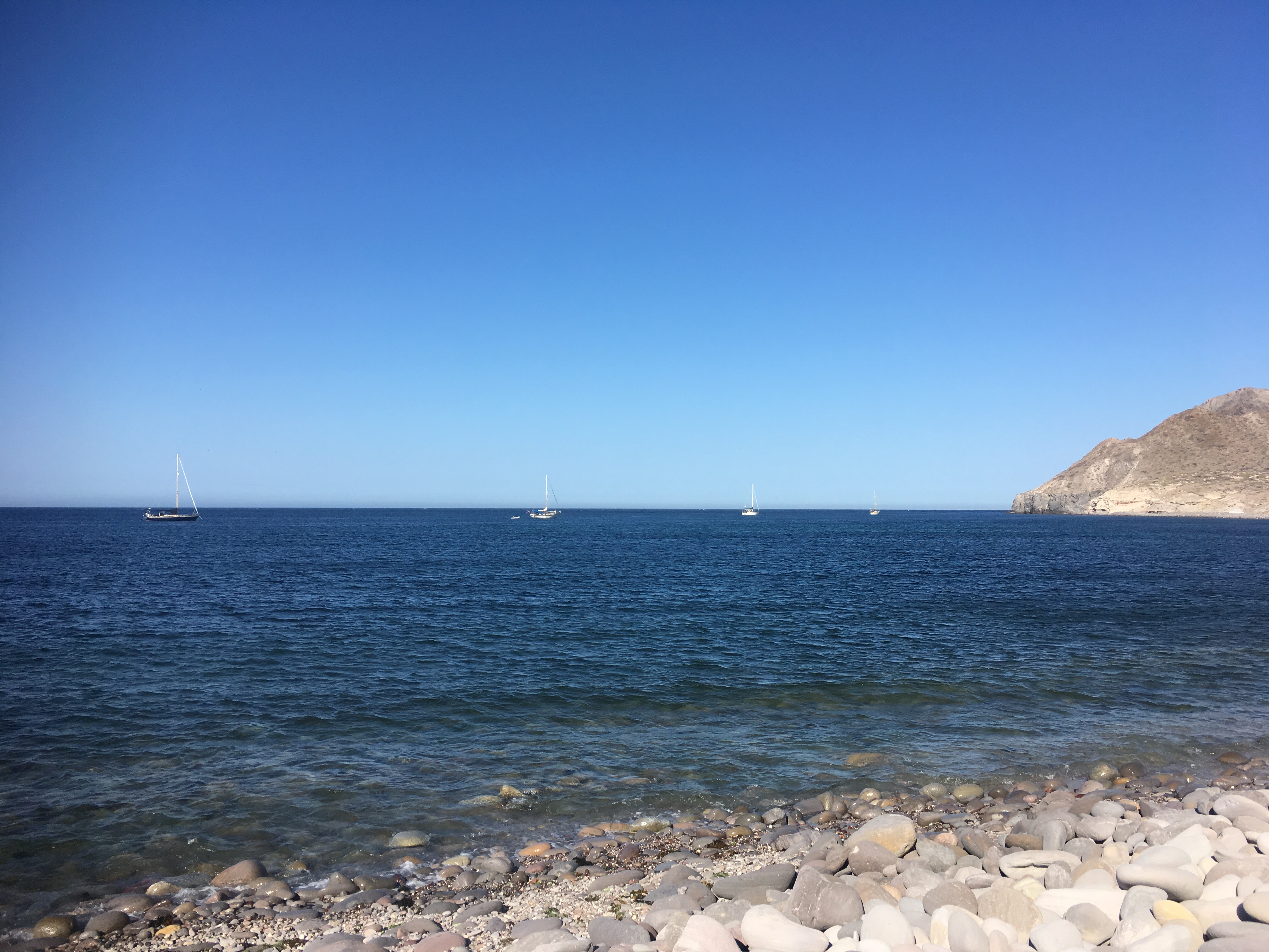 Not long after we got back to the boat and had dinner, the southerly swell started to wrap around and make its way into the anchorage. We had our flopper stopper out, as did Easy, but there was no comfort being found at this spot. We called Easy, Kenta Anae and Dad’s Dream and announced that we were pulling up anchor and heading up around the corner to San Nicolas, 26.868896, -111.848712. The stay there was just for an overnight before heading up and around to Bahia Conception. All four us us made the move to San Nicolas just after sunset, but before dark. The anchorage was much more comfortable than San Antonio and we were that much closer to our next stop, 26.870196, -111.846589 , about 30 miles away for another brief overnight sleep. The three of us sailed up together. Dad’s Dream stayed behind. The sail up and around was beautiful and uneventful. Kenta Anae kicked our butts (they are fast! There, I said it out loud, Merle!).