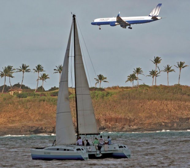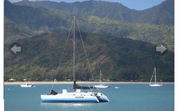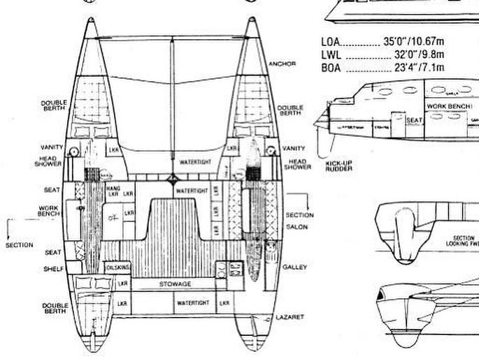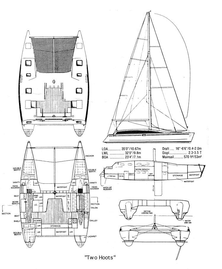 John Shuttleworth designed catamaran w/ round bilges, plumb bows and dagger board in each hull. Flush decks and open cockpit aft; companionway with hatches steps down to cabin areas in each hull.
