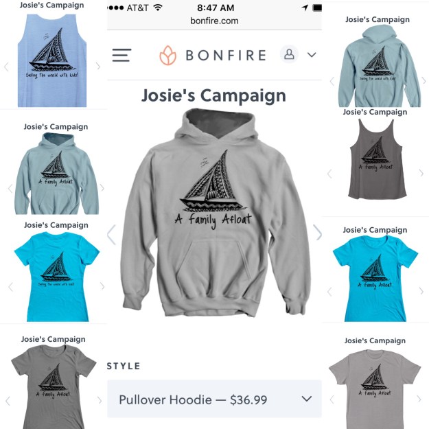 Last day to Help us keep the posts coming while we continue sailing around the world! Even from the middle of the Pacific Ocean! Purchase a shirt/sweater through our Bonfire Campaign or you can click on any of the pictures below. Pictures whist a sample of style and colors. Choose your favorite on the Bonfire site.