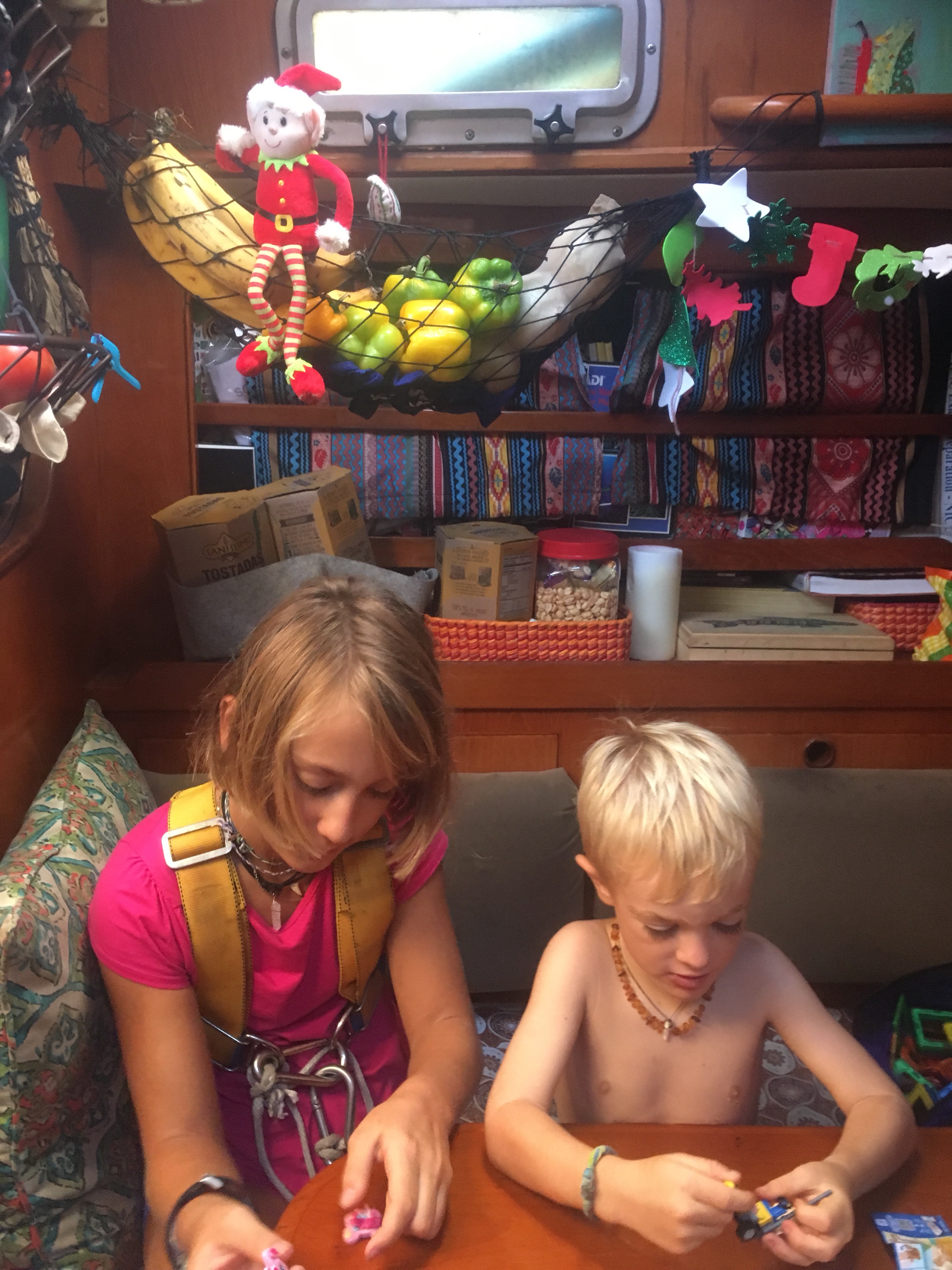mas time! It was everybody aboard’s first Christmas out at sea. Santa received our tracking information from our IridiumGo and PredictWind tracker. The wind was still blowing 15-20 with the swell slowly getting bigger, but now a little more on our beam. The kids were excited, they had no problems staying down below to open presents and go through their stockings. It was a great day! We all started to acclimate to the new sea state that blew persistently between 20-28 as the day progressed. We maintained our double reefed main and adjusted the furl on the jib accordingly. I managed to put together a nice Christmas dinner. I had defrosted Mahi Mahi (thanks SV Scuba Ninja for the fish!) and planned on making a cranberry crisp, so I was determined to make that happen. I felt less woozy, but was aware of my limits. Dinner was prepared in segments with a lot of outside on deck time in between for fresh air. I did it though! Mahi Mahi, browned butter “Herbs de Provence” and garlic mashed potatoes, stewed carrots, and cranberry crisp for dessert. Our Christmas Day ended well. We all turned in at 8pm, Nina took her watch from 8-11p.