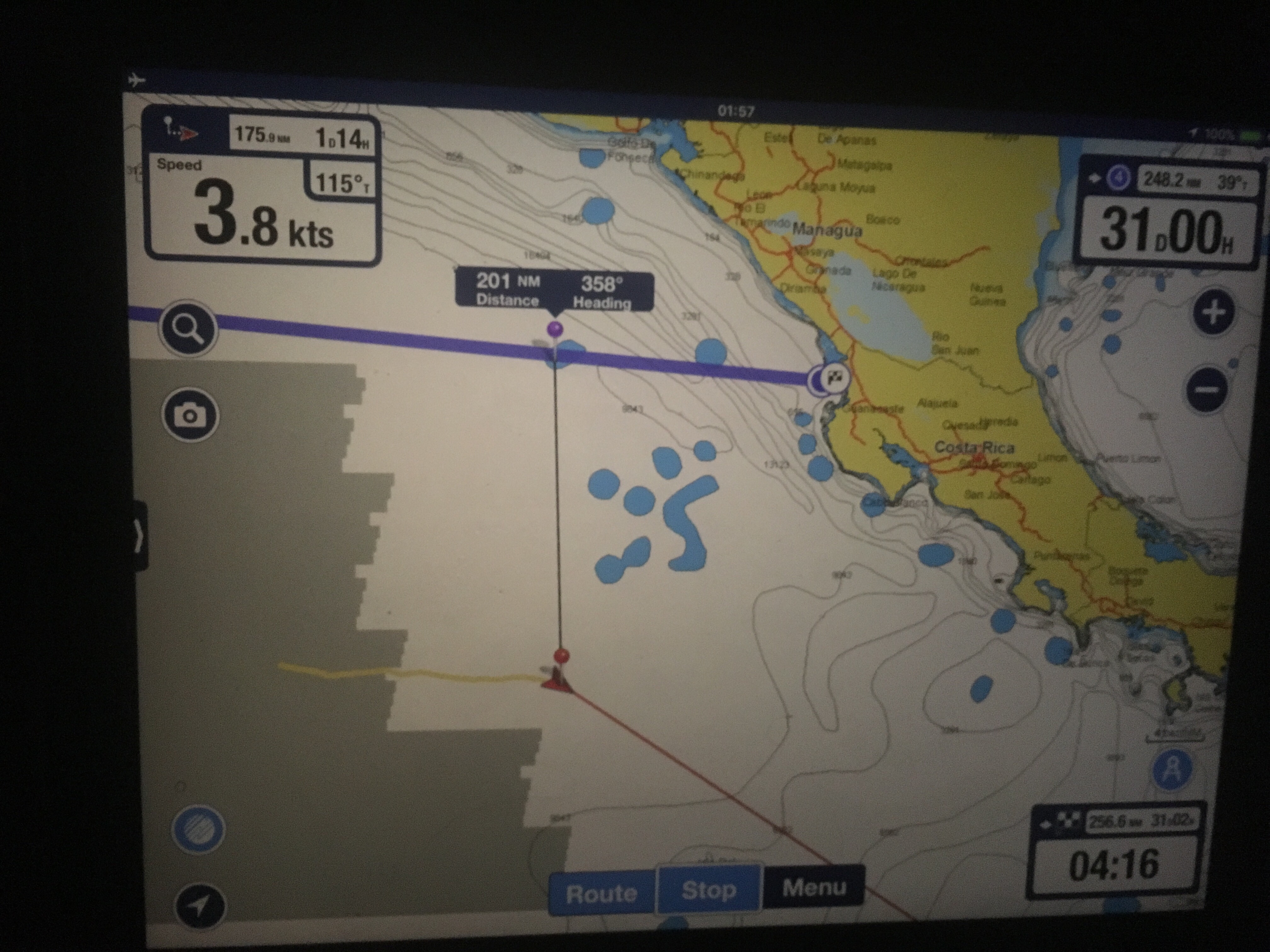 Addendum : Day 17, January 1st, 2018. We are closing in on Costa Rica. With a 80 mile day, we drifted quite a bit of it, motored for 4 hours of it, and sailed upwind at 2-4 kts for the rest of it. The last few days have been quite overcast, nice on the temperature not so nice for the battery bank, so motoring was well used. We charged batteries, kindles, toothbrushes, used the blender etc. We are all excited at the prospect of seeing land tomorrow. Although it’s highly likely that we won’t come into anchor until Wednesday, depending on our wind. We won’t be making landfall as far north as we’d hope for, but we are managing to head up fairly high.