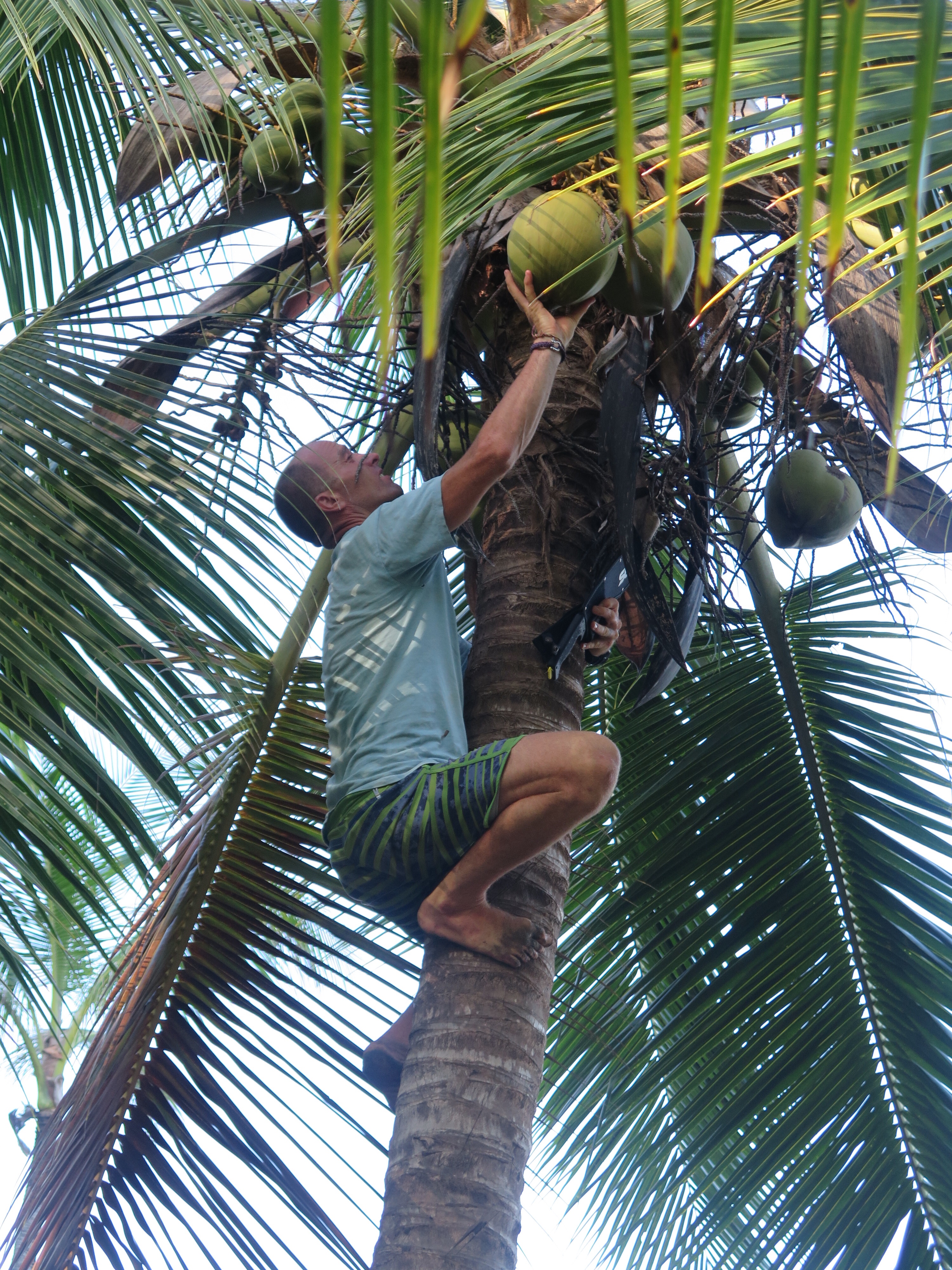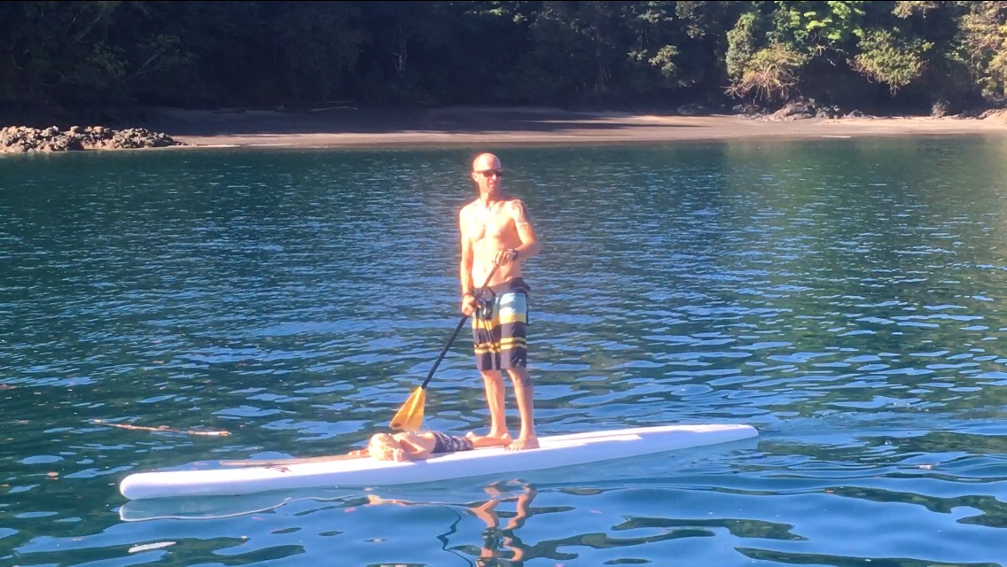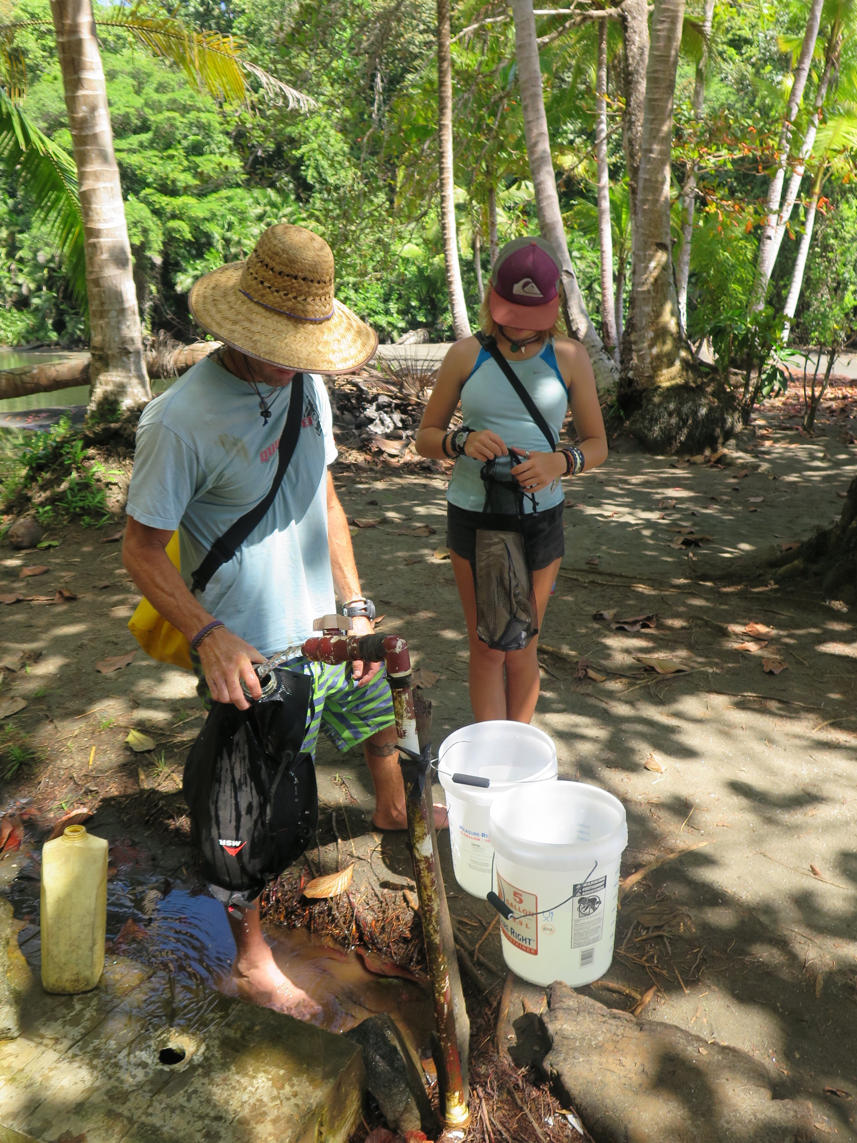 The next day there, we swam and paddle boarded. We also took buckets to shore to fill up at the fresh water spring. We found two older Panamanian boys siting around the spring. It turns out, the whole island is privately owner and by many different people. They were there to watch that particular property. With my not so good of spanish we did establish that we were allowed to walk around and they also let us fill up on fresh water. In the afternoon, we had coconuts on the beach. A deer came and joined us for coconuts scraps to wrap up the day before dinner.